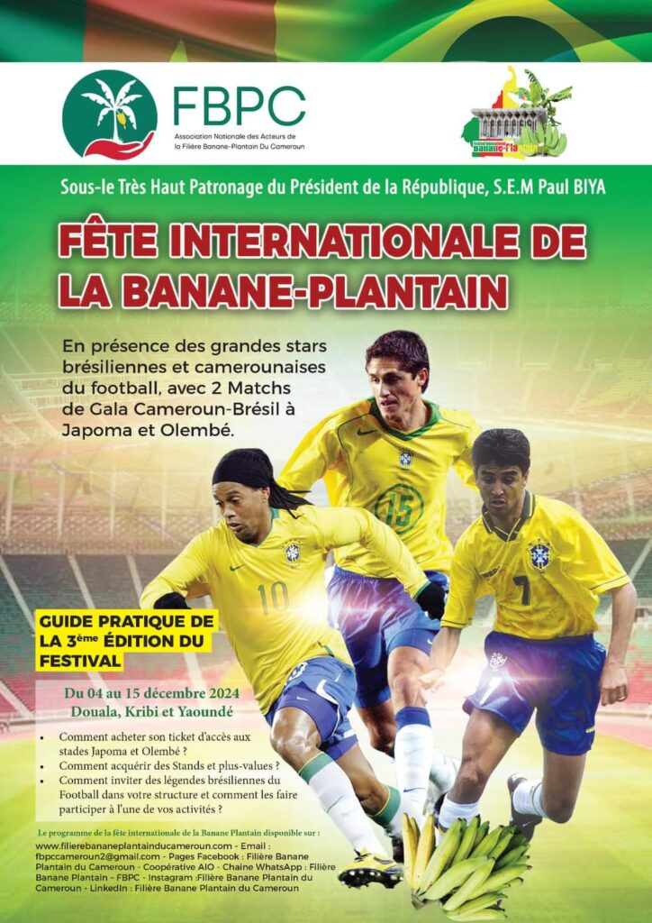 Placée sous le Haut Patronage du Président de la République, cette manifestation se tiendra du 04 au 15 décembre 2024 dans trois villes du pays : Douala, Kribi et Yaoundé. L’événement vise à mettre en lumière le potentiel et les acquis de la filière Banane-Plantain au Cameroun, tout en renforçant la coopération avec le Brésil.