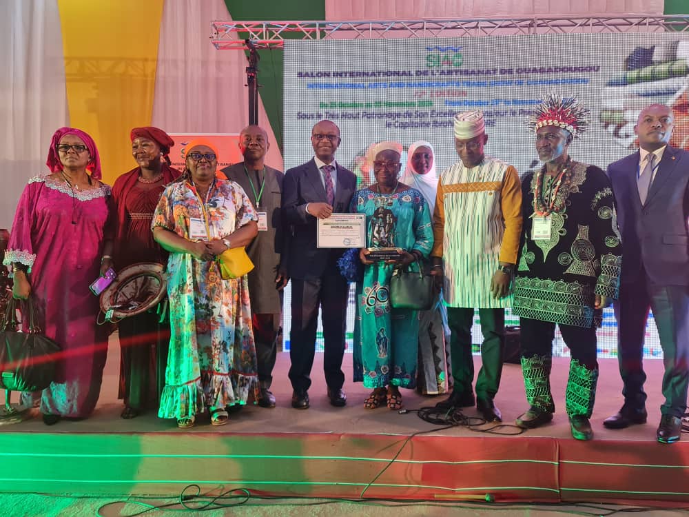Par ailleurs, des concours ont été organisés. Comme distinctions majeures, le génie de nos artisans leur a valu d’impressionnantes distinctions, dont le prestigieux Premier Prix de la Créativité des œuvres artisanales, Prix du Président de Transition du Burkina Faso. Ce prix a été décerné lors de la cérémonie solennelle de remise des prix présidée par le Premier Ministre du Burkina Faso à Madame Rose Mary FOINTEN, artisane camerounaise, pour la confection d’un tapis à base de plastique recyclé.