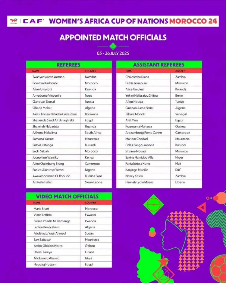 La Confédération Africaine de Football (CAF) a dévoilé la liste officielle des arbitres pour la prestigieuse Coupe d’Afrique des Nations Féminine TotalEnergies, qui se tiendra du 5 au 26 juillet 2025 au Maroc.